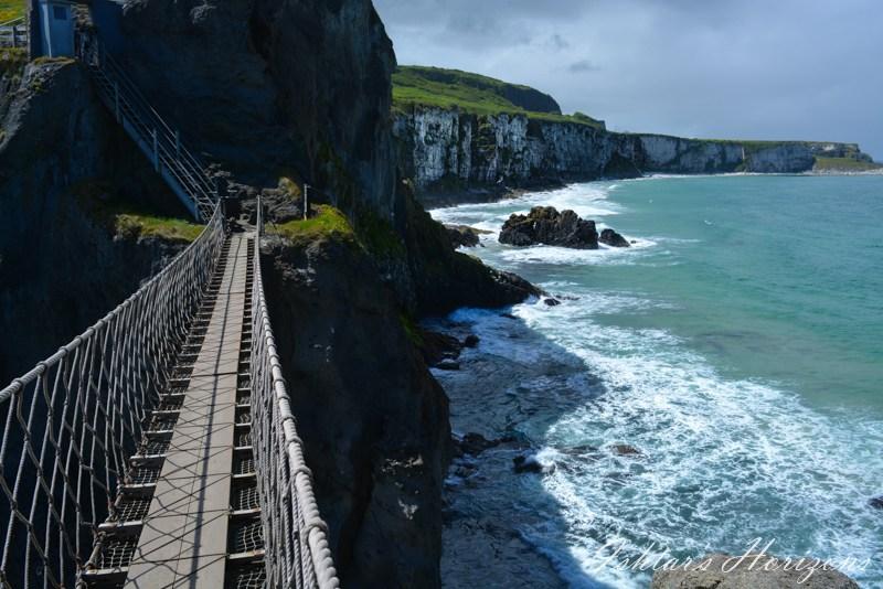 Estar rodeados de unos majestuosos acantilados, cruzar el puente colgante escuchando el crujir de las cuerdas con el vaivén de tu andar, mirar hacia abajo y contemplar el oleaje incesante rompiendo contra las rocas, no tuvo precio, bueno sí, 7£ (libras) . Las fotos atestiguan la belleza del lugar: