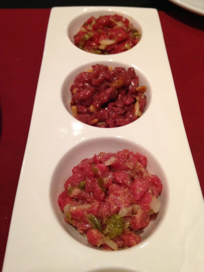 Normalmente cuando venimos aquí nos dejamos aconsejar, pero hay un plato que no falla: el steak tartar. Ya conocéis mi amor por este manjar (incluso lo probé en su país más típico: Polonia) y en este caso pedimos un trío como entrante: steak tartar clásico, de pato, y de ternera nacional con mostaza de Dijon. Me gustaron todos, pero el clásico no puede estar más bueno con su toque picante: