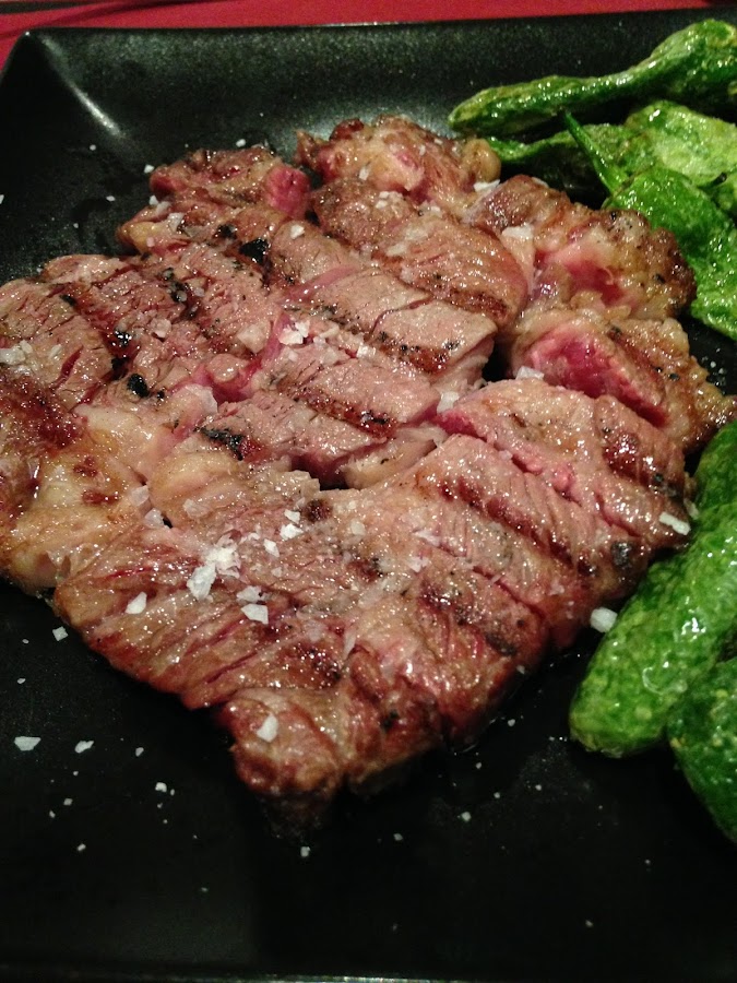 Y llegando al plato fuerte, las carnes (espectaculares), he de deciros que nos vinimos arriba. Pedimos para compartir un plato de magret de pato, una de las carnes más tiernas y sorprendentes que he probado, entrecot de Angus y picaña de Kobe. Aquí os dejo el espectáculo por orden: