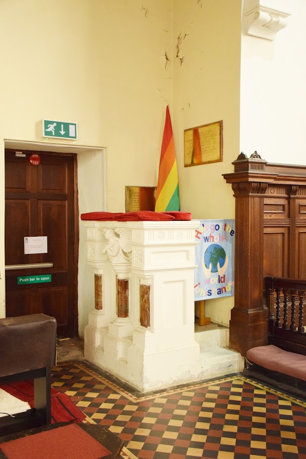 No encontramos una explicación concreta, pero de repente vimos toda una declaración de principios en el tablón de anuncios: "We are committed to taking all people seriously - married and single people, gay and straight, those who have a natural faith and those who struggle with belief." (Nos comprometemos a tomar todas las personas en serio - casados y solteros, gays y heterosexuales, a todos los que tengan una fe natural y quienes luchen con convencimiento y principios por ella.)