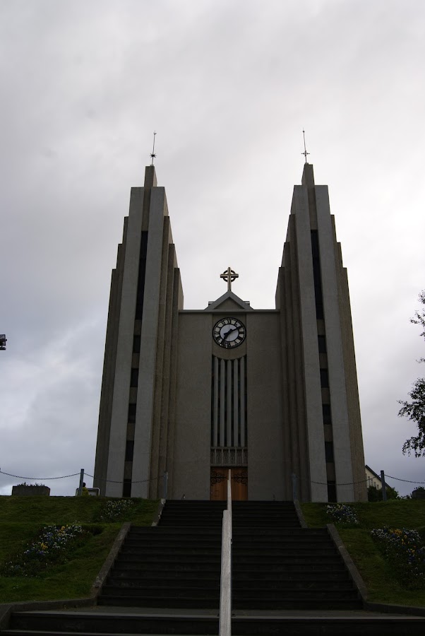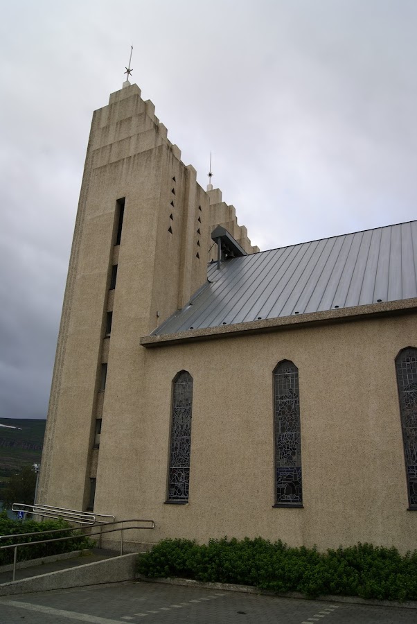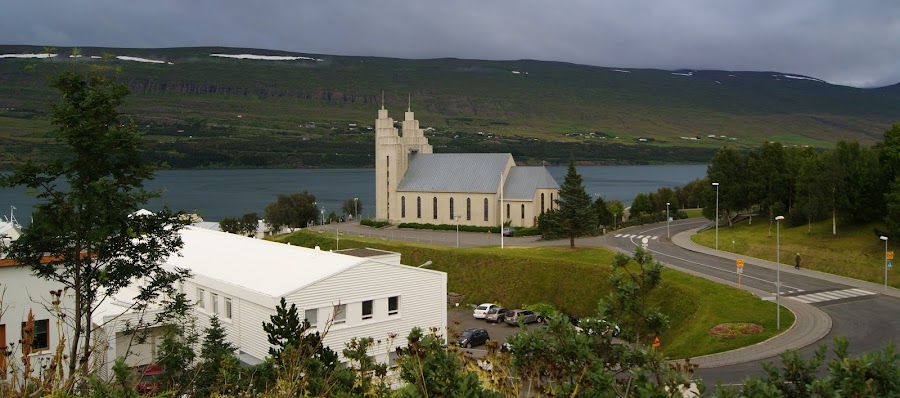 Quizá lo que más llama nuestra atención desde que empezamos la aproximación a Akureyri sea la espectacular iglesia que se levanta en lo alto de una colina, obra del genial Samúelsson, autor del espectacular templo Hallgrímskirkja de Reikiavik.
