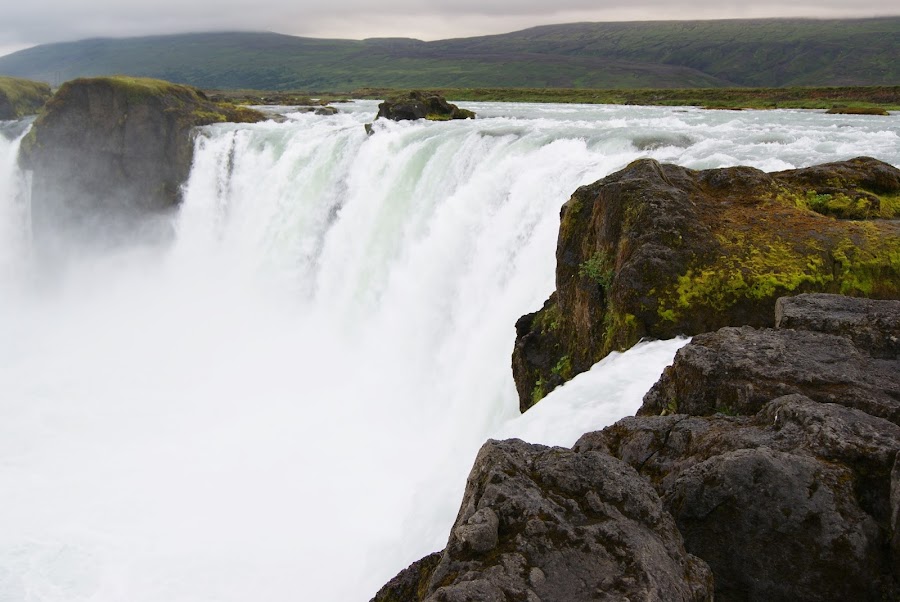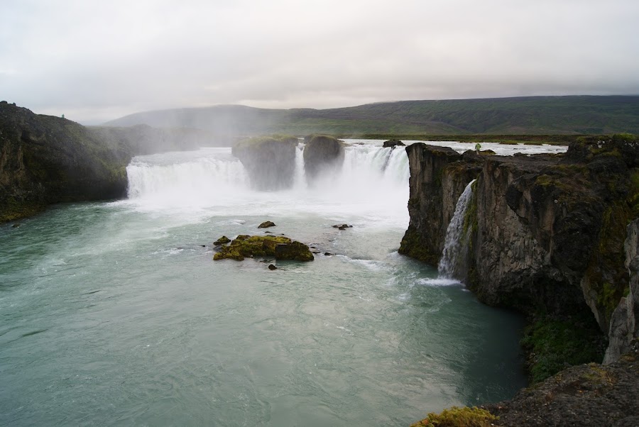 Unas de las más hermosas y espectaculares cascadas de Islandia, es sin duda Godafoss, que rompe con la fuerza de sus aguas el extenso campo de lava de Bardarladur. Quizá no sea la más grande de la isla, pero si una de las más impresionantes y hermosas. Se dice que su nombre proviene del momento histórico en que Thorgeir, el máximo legislador, decidió que la isla debía dejar atrás su legado pagano y a sus antiguos dioses para adoptar la religión cristiana. Para dar ejemplo, corrió a su casa y tomó todas las esculturas y estatuas de Thor, Odín y demás familia nórdica. Corrió hacia la cascada y los arrojó a las frías e impetuosas aguas, donde desaparecieron para siempre.