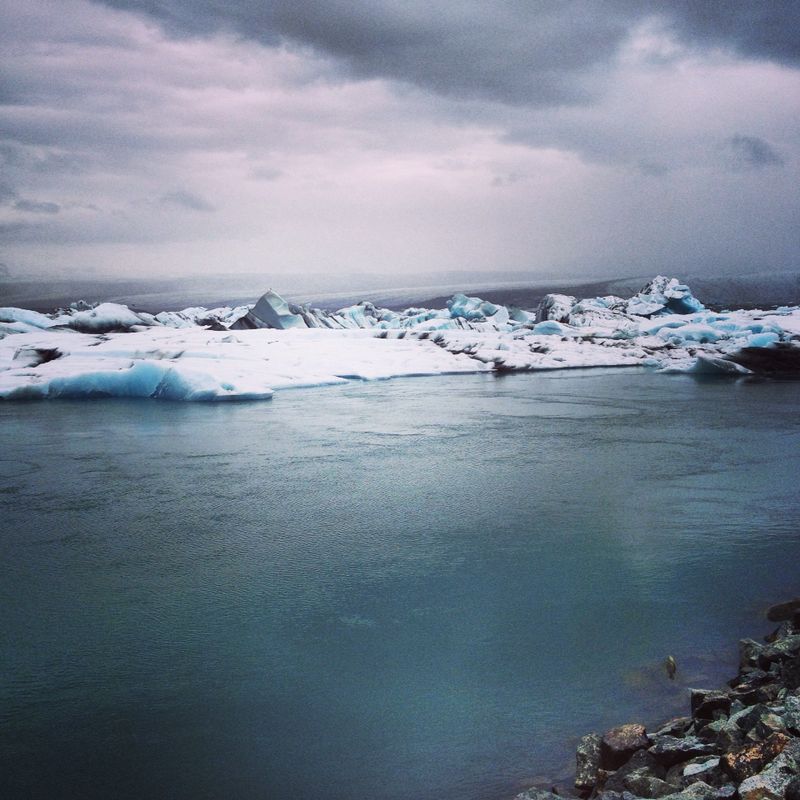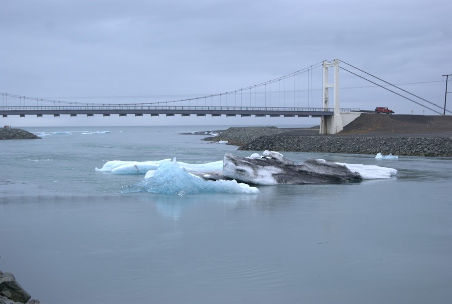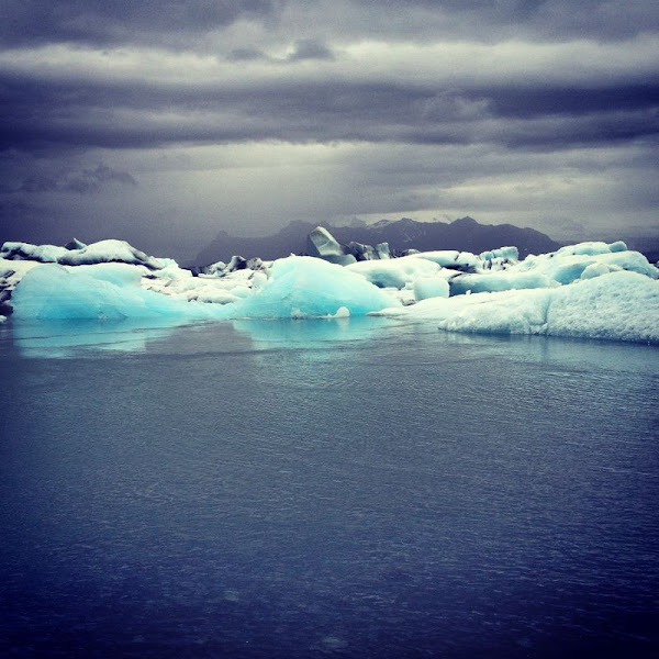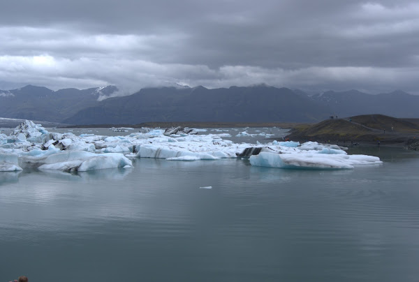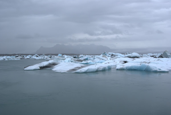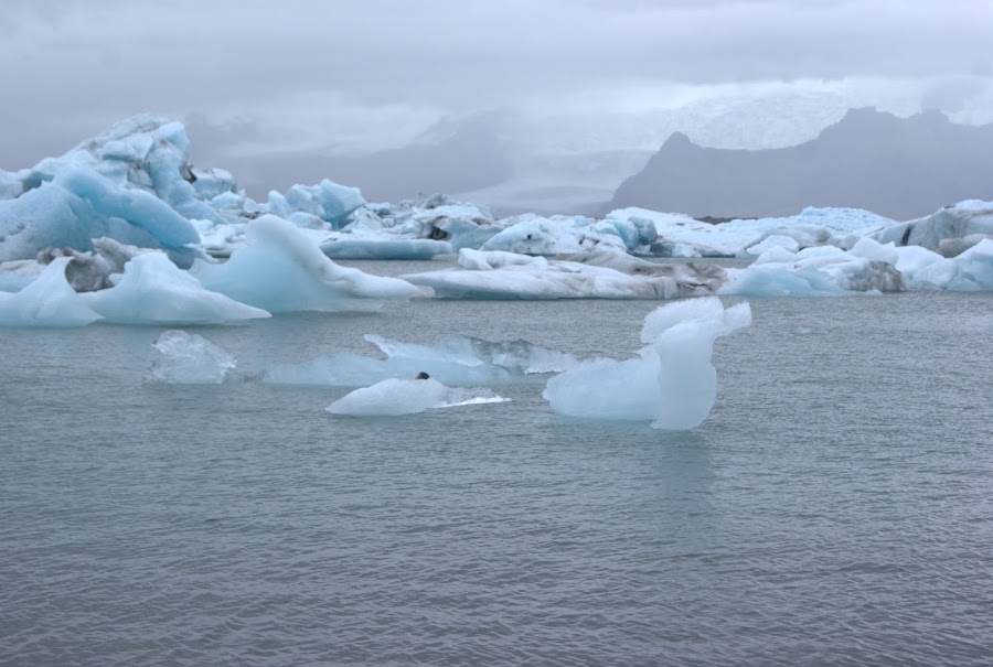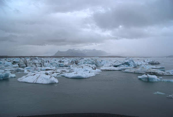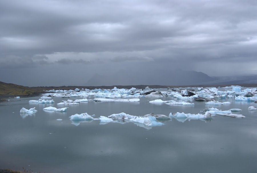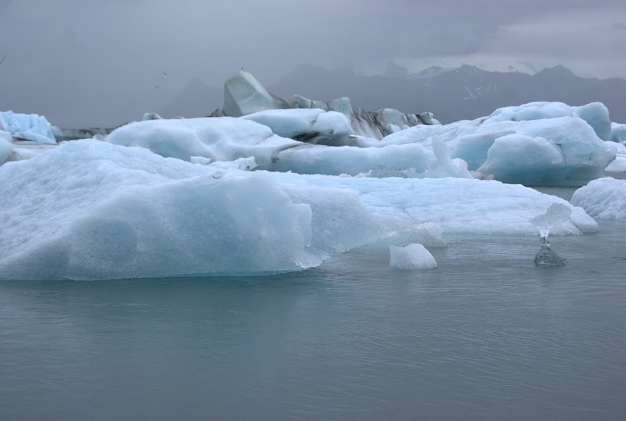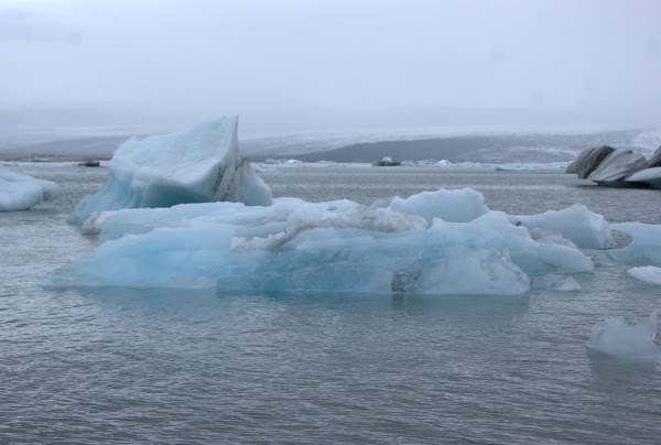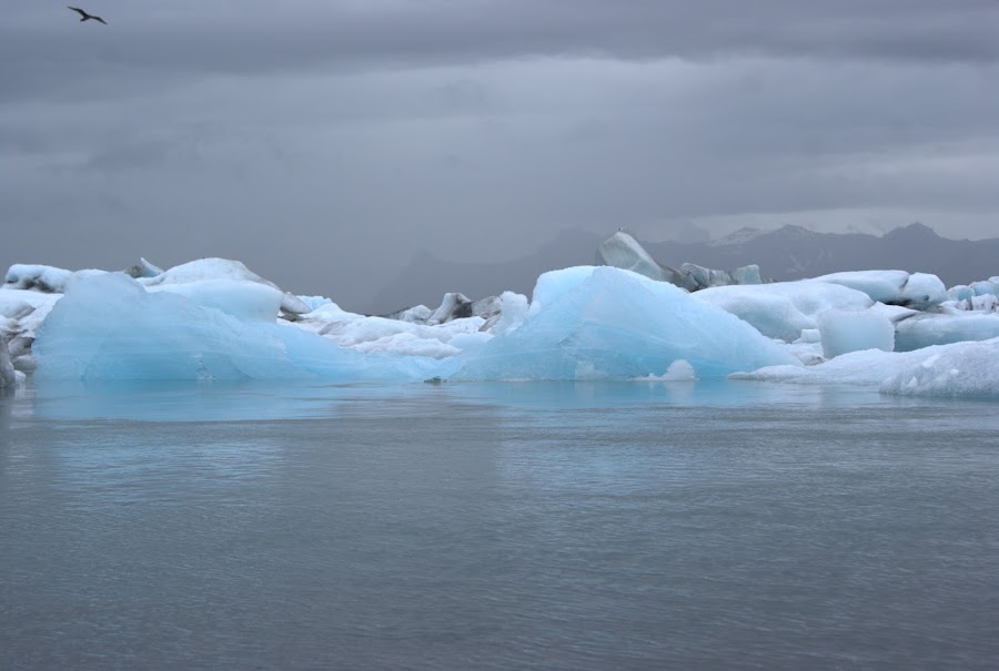 Sin embargo estamos en el sur de Islandia, en esta laguna que conjuga el agua en todas sus formas: hielo, lluvia, nieve...Naves fantasmas que navegan sin rumbo fijo o que más atrevidas se dirigen directamente al mar, donde se fundirán con el agua salada. Pequeños icebergs o grandes bloques de hielo que se desprenden de las lenguas de los glaciares y que se convierten en mantequilla bajo la acción erosiva del viento y del agua que juega con ellos para esculpirlos en mil formas antojadizas.