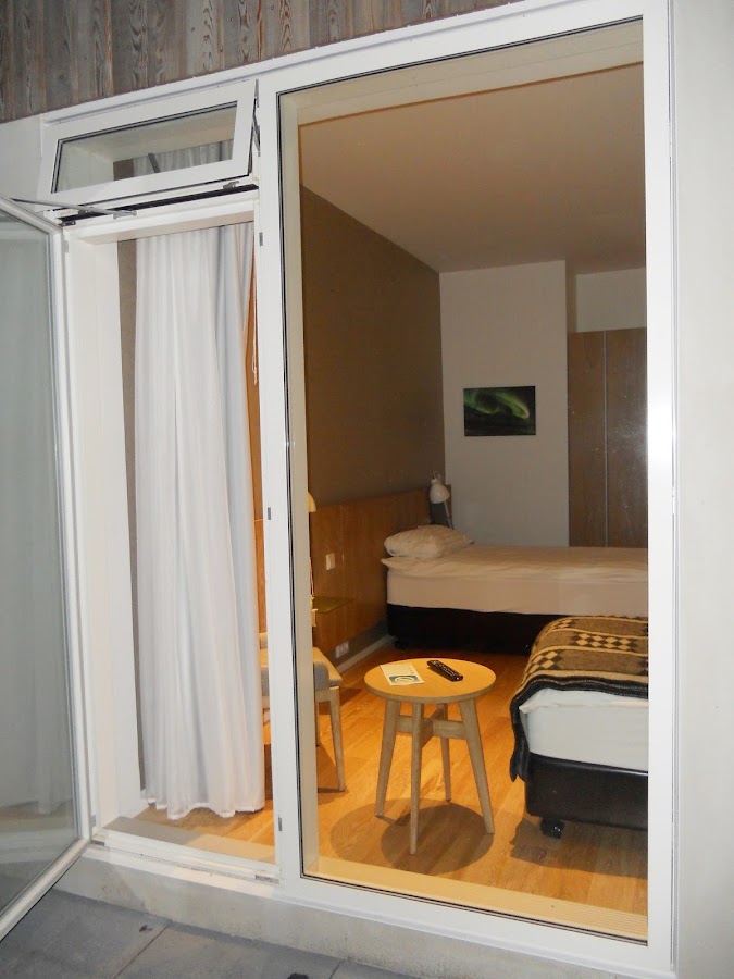 Las habitaciones llevan el nombre de glaciares y volcanes de la isla, alineadas a los lados de unos pasillos en cemento crudo, un poco fríos para mi gusto. Eso sí, el diseño nórdico es una constante en todo el hotel, y las estancias no iban a ser menos, baños en pizarra y acero, comodísimas camas de confortables edredones y la sorpresa de un acceso directo a los jardines, que son ni mas ni menos que la misma pradera donde se levanta el hotel.
