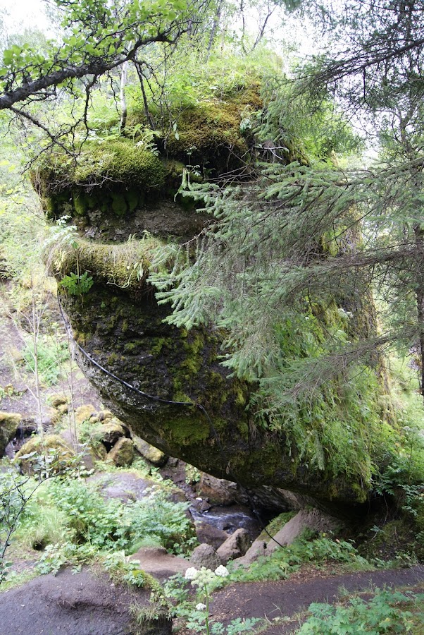 Precisamente la leyenda cuenta, que en este sitio en concreto se levantaba la antigua iglesia que da nombre al pueblo y de la que hablábamos en el rincón anterior, aquella arrasada por la feroz erupción del Leki. Así, que echándole un poco de imaginación, debemos ver el suelo del templo casi engullido por el campo de lava de Eldhraun e imaginarnos que un día aquí hubo un monasterio y que ésta sería su capilla.