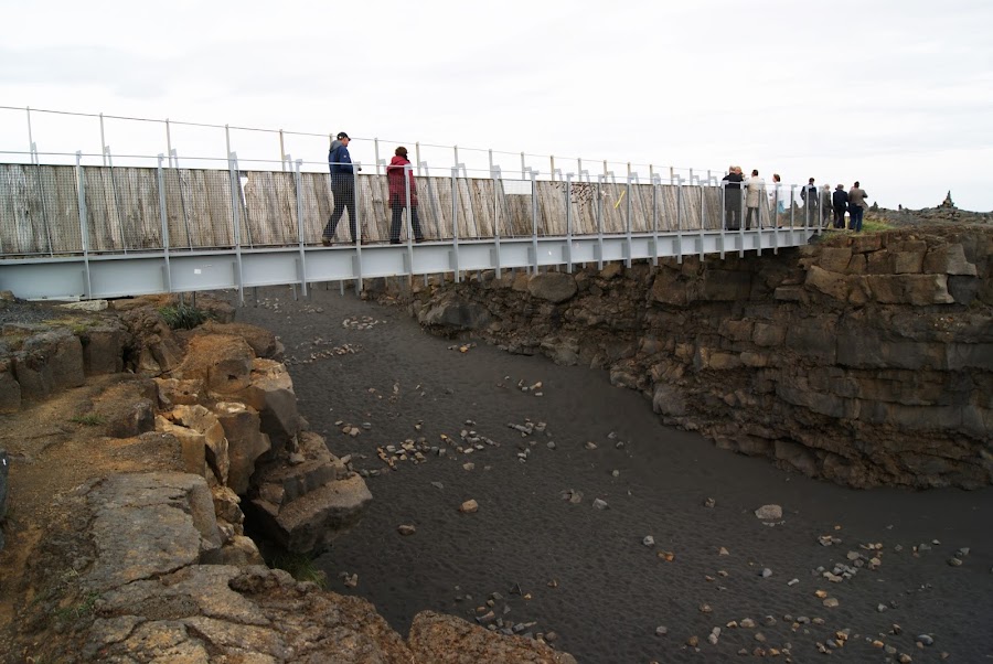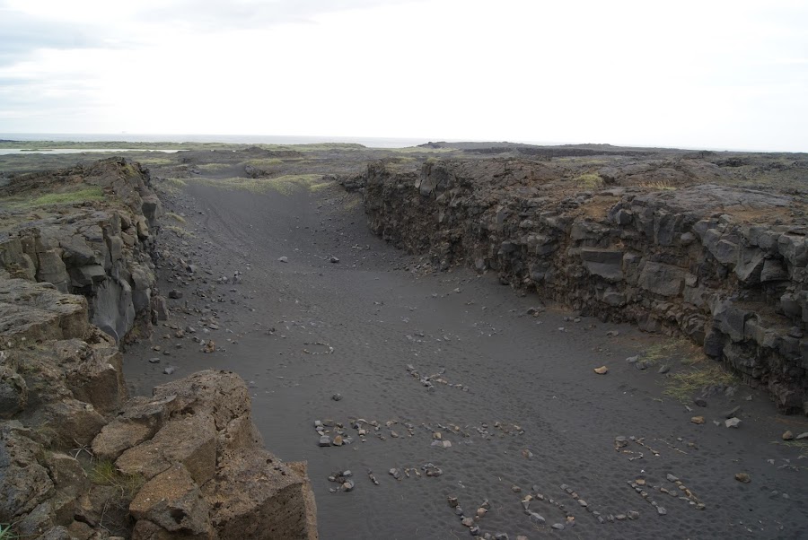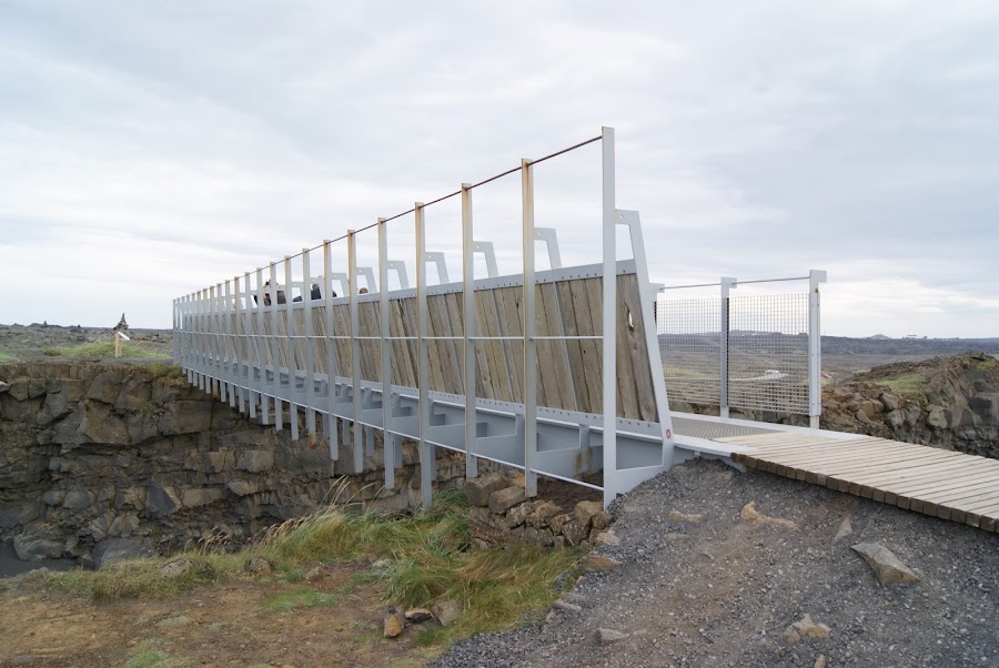 En esta ocasión, y tras dejar atrás varias fábricas abandonadas, otras que aún funcionan y sobre todo varios santuarios de aves marinas, que gracias a que esta lengua de tierra permanece casi virgen, siguen dando cobijo a multitud de especies que pueblan la costa de la isla, llegamos a uno de los lugares más curiosos de esta zona. Tras aparcar el coche nos acercamos a un puente que cruza un río de arena volcánica negra que sirve de unión entre la placa tectónica americana y la europea. El punto que separa o une el este del oeste. Las placas se separan a razón de 2 centímetros cada año y es lugar de frecuentes terremotos y corrimientos de tierra y se dice que este punto de Islandia y dos que se encuentran en el este de África son los únicos lugares donde podemos observar este fenómeno a nivel de superficie.