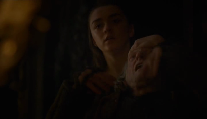 Posteriormente y cuando Jaime ya regresaba a Desembarco del rey, Walder Frey se disponía a cenar tranquilamente servido por una de sus sirvientas. Cenaba una empanada de carne, cuando le pregunto a la sirvienta el por que de que no estuvieran sus hijos cenando junto a él, la misma le responde que mirara en su interior. Walder descubrirá unos dedos dentro de la empanada y la sirvienta le explicara que la carne era de sus hijos. Dicho esto, la sirvienta se quita la mascara que tenia como cara y vemos como era Arya Stark quien la interpretaba. Entonces comienza a rajar el cuello de Walder similarmente a los sucesos de la Boda Roja como muchos habrán visto. Arya Stark disfruta de su venganza que no ha hecho mas que empezar, esta vez utilizando todo lo que ha aprendido mas allá de Poniente.