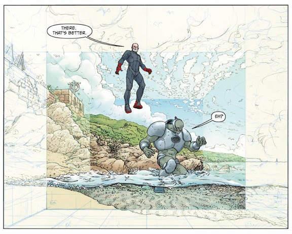 La verdad es que el argumento de Jupiters Legacy es bastante interesante, y lleva un ritmo frenético, lo que hace que devores cada página casi sin darte cuenta. Y así sería si no fuera por los lápices de Quitely, el otro 50% de la criatura, que hace que te detengas en cada viñeta para apreciar todos los detalles y el gran trabajo que llevan detrás.