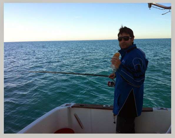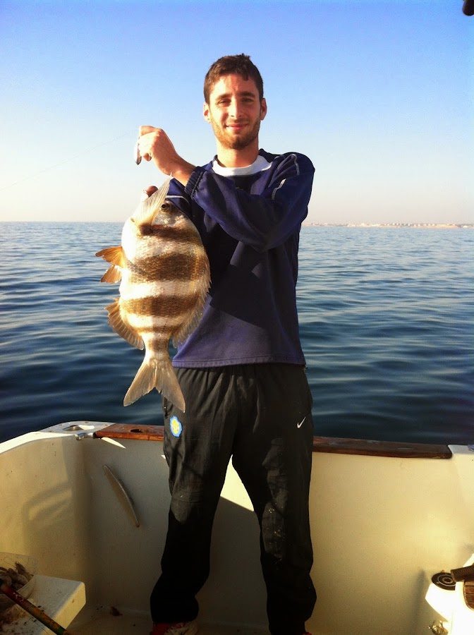 Mi primo Enrique, otro gran aficionado y habitual tripulante del AVIZOR, muestra orgulloso una buena captura (SARGO IMPERIAL DE 2 KG). Capturar piezas como ésta supone una gran dosis de adrenalina que enganchan de por vida al pescador novato.
