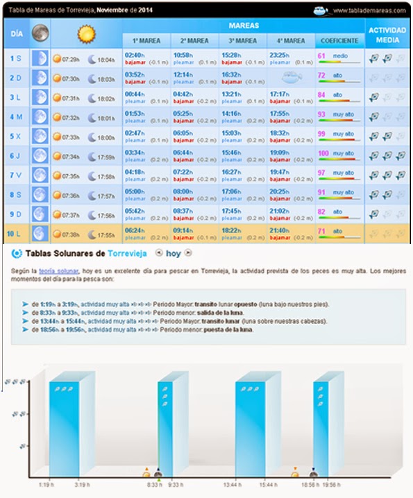 Las tablas solunares (www.tablademareas.com), donde se indican las mareas en función del ciclo lunar, es una herramienta que en algunos casos nos puede servir de ayuda para predecir la actividad de los peces. En cualquier caso, y en base a mi experiencia, no son demasiado fiables, puesto que existen otros factores que pueden enmascarar y/o predominar sobre éste.