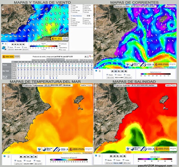 Mapas de viento, corrientes, temperatura y salinidad de la web de Puertos del Estado. La consulta de los dos primeros es un ritual obligado previamente a cada salida a la mar.