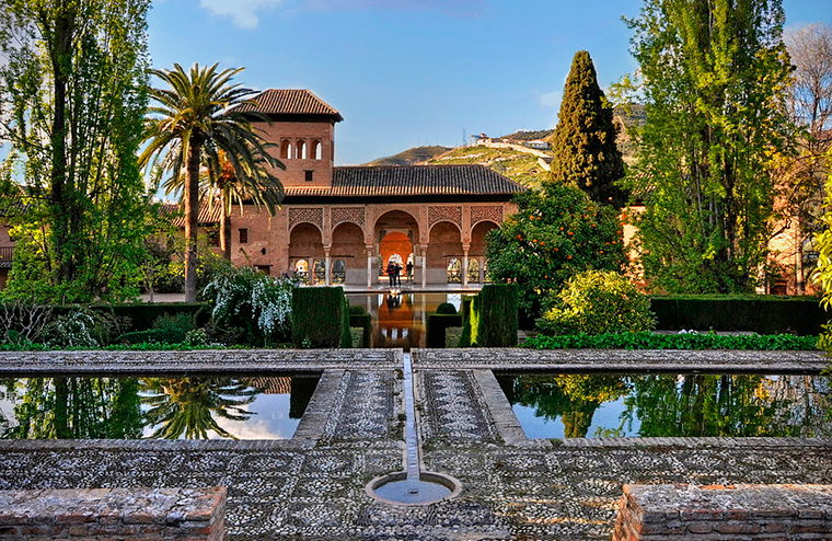 Los jardines árabes son muy fáciles de identificar. Están diseñados para el disfrute de todos los sentidos evocando un oasis o el jardín del Edén. Se usan flores y otras plantas aromáticas para el placer olfativo, se juega con el murmullo del viento, el canto de los pájaros y el sonido del agua para el oído y el dibujo geométrico, el diseño y la poda de los setos para estimular la vista, pues en esa época se buscaba dominar la naturaleza; la vegetación y el agua. Eran amantes de la matemática, la astronomía y la geometría, por lo que aplicaban estos conocimientos al arte. El agua también era un bien muy escaso y valioso, por lo que siempre está presente en todos los palacios y jardines árabes. Además siempre eran lugares cerrados al exterior y jardines o estancias laberínticas como podréis ver en el Alcázar de Sevilla, de Córdoba, cualquier palacio árabe o aquí, en la Alhambra. Rara vez tenían miradores al paisaje exterior.