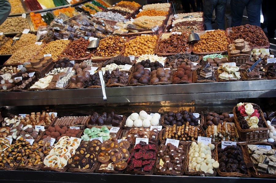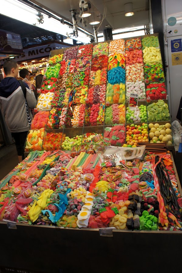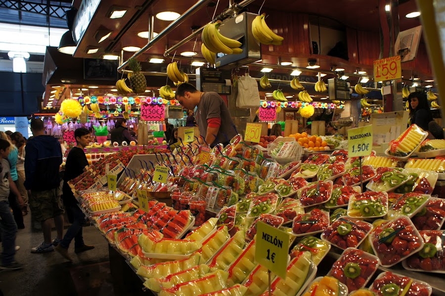 Chocolates, dulces, carnes, ensaladas, especies, pero lo que más me gusta de La Boquería son sus frutas, la venden entera, troceada, en helados, en coloridos zumos.