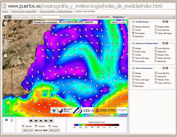 Una de las cosas que hacen apasionante este deporte es que casi todos los días son diferentes, debiendo tenerse en cuenta diversas variables según circunstancias que unos días apenas influyen y otros son tremendamente decisivos, y que en muchos casos son dificiles de determinar o conjugar. En el caso de hoy, es probable que buena parte del éxito radique en el análisis previo de un factor fundamental: la corriente o "marea". La noche antes (sospechando su influencia por el "chivatazo" de un amigo ? José Ramón- que había salido en días previos y me comentaba un aumento progresivo de la misma), consulté unos mapas de la AEMET en los que se predicen (con cierto margen de error) las posibles corrientes marinas. Comprobé que, en efecto, era más que probable una moderada corriente del NE que podía complicar obtener resultados favorables. Pero mis expectativas pesimistas, fueron en parte compensadas por Andrés, que también había realizado una particular consulta basándose en unas tablas lunares (de las que yo me confesaba escéptico, hasta hoy) que indicaban para la fecha una actividad máxima del pescado en la franja de las primeras horas de la mañana, como así se ha demostrado.