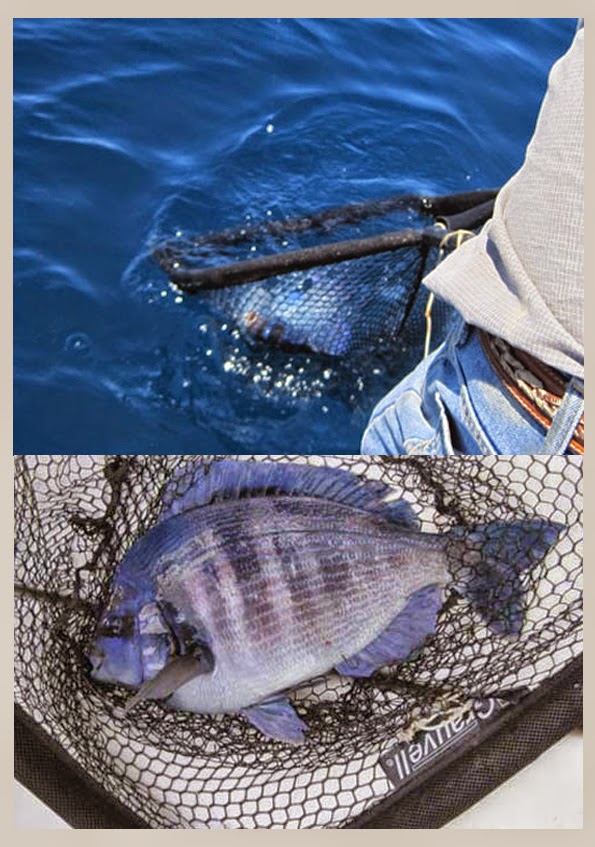 SECUENCIA DE PESCA DE UNA GRAN CHOPA. Arriba nuestro compañero Manolo Ruiz sube con precaución, dadas la finura de su caña y aparejos una gran chopa. Abajo: acción de salabrado de una chopa macho de más de 1 kg.