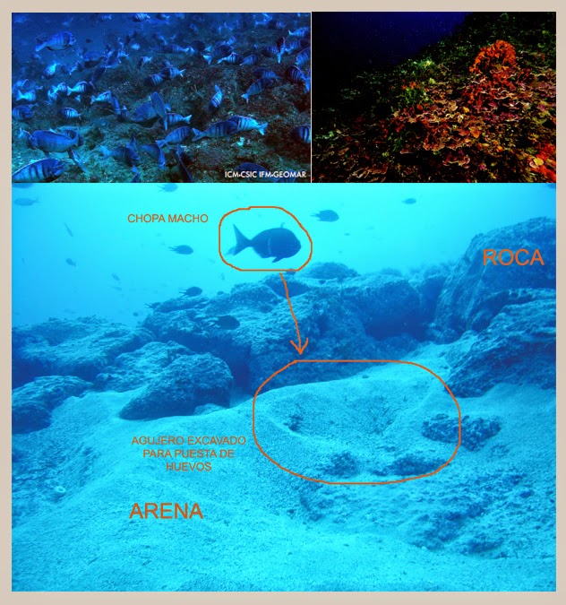 Imágenes de los fondos en que habita la chopa en su ciclo reproductor. Especialmente tiene tendencia a fondos rocosos con arenas alrededor.
