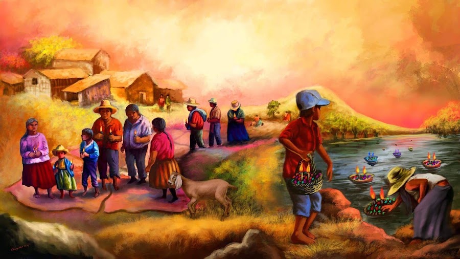 En la noche central, cuando el río ya tiene las aguas transparentes, la gente se aproximaba respetuosamente a las orillas y una a una prendían las velas del centro de las canastitas y eran depositadas con mucha fe en la apacible corriente del río que se las lleva lentamente al mar, bajo la atenta mirada de los familiares y amigos que se unían a la fiesta nocturna, dejando un gran rastro de canastitas con velas que formaban una marea de pétalos con fuego multicolor que adornaban el río como nunca, y él, enseñoreado con tales ofrendas, se hinchaba hasta tocar las riberas con sus frescas aguas y la gente volvía a recoger de ellas el líquido como los antepasados y lo llevaban hasta las casas en memoria de los viejos tiempos.
