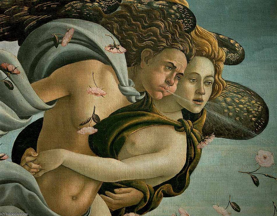 A la izquierda del cuadro vemos a Céfiro y Cloris, dos vientos que gracias a su soplo otorgan esencia espiritual a Venus. Entrelazados en un abrazo simbolizan la unión de la materia y del espíritu. Fue Céfiro quien secuestró a Cloris en el jardín de las Hesperides, se enamoró de su víctima y ella consintió convertirse en su esposa. Las rosas que les rodean, según la mitología antigua, fueron creadas al mismo tiempo que el nacimiento de la diosa del amor. Sus espinas recuerdan que el amor puede ser doloroso.