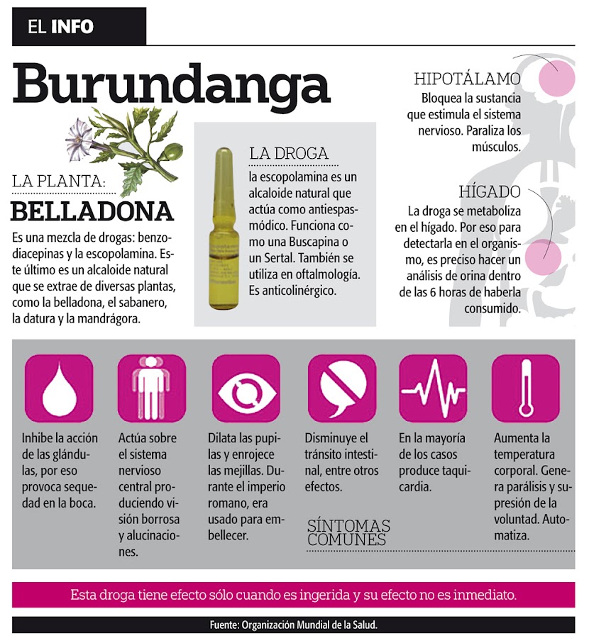 Se trata de una sustancia que administran algunos delincuentes y agresores sexuales para anular completamente la voluntad de las víctimas. La burundanga también produce desinhibición y crea amnesia. Ésta se ingiere sin ser percibida oculta en bebidas, incluso se inhala, soplada a la cara.