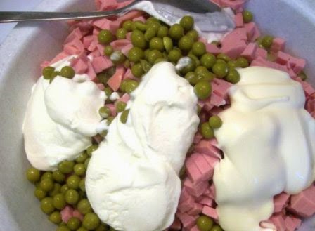 9. Añadimos mayonesa (normalmente son unas cucharas grandes).10. Mezclamos los ingredientes y mayonesa.