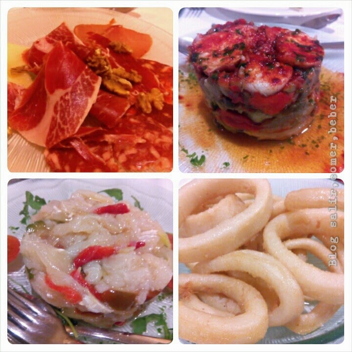 Elegimos para cenar, un surtido de ibéricos, correcto de calidad aunque un poco escaso de cantidad, seguimos con un milhojas de pulpo, patata y escalibada, una combinación muy acertada, el pulpo estaba en su punto.