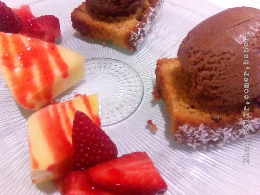Para finalizar un postre variado compuesto de bizcocho, helado de chocolate y fruta natural, sencillo, casero y muy bueno.
