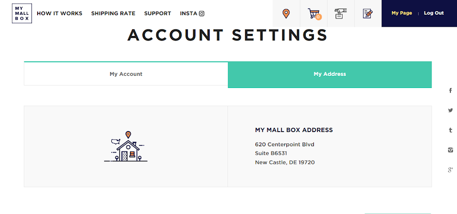 Al iniciar en nuestra cuenta de My Mall Box con nuestro email y contraseña veréis la página de inicio. Para saber la dirección exacta de vuestro buzón debéis ir a account settings. Una vez dentro pulsaremos en My adress y esa es la dirección de vuestro buzón y la que debéis de poner cuando hacéis un pedido a EEUU. Si te desplazas hacia abajo en la página podrás poner la dirección de tu casa para que envíen los paquetes que recibes en tu buzón.
