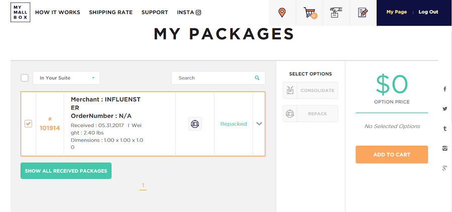En la pestaña my packages es dónde podréis visualizar los paquetes que recibís y su contenido. Cuando recibís un paquete lo primero que debéis hacer es repack para que My Mall Box empaquete vuestros paquetes ocupando menos dimensión y peso, pero a la vez lo envuelven si es algo frágil mucho más protegido para que llegue a tu país evitando sufrir ningún daño. El repack suele tardar unas 24h laborables, si lo hacéis en fin de semana tened en cuenta que tardará algo más. Una vez que ponga repacked, pulsar en la flecha que tiene al lado al botón add to cart.
