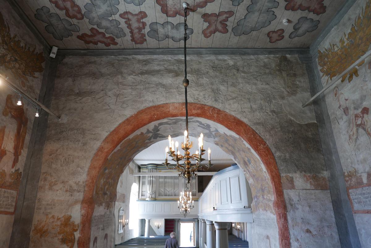 El mural ocupa un tramo de pared arqueada en el presbiterio que se encuentra entre dos y tres metros por encima del suelo. Está en una escala tan fina que, “cuando te paras en el suelo y miras hacia arriba, es como una nube gris. Se ve sucio en la pared, dice Andersen. “Es imposible para un visitante ver los detalles, lo extraño y fascinante que es caótico, y es tan pequeño; una figura en una figura en una figura”.