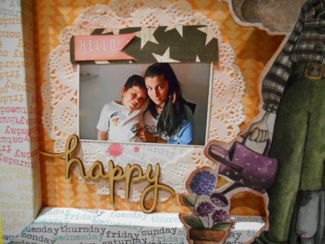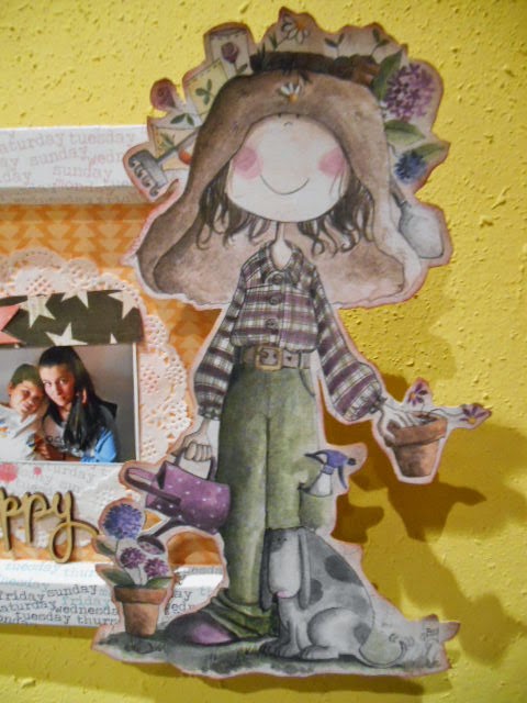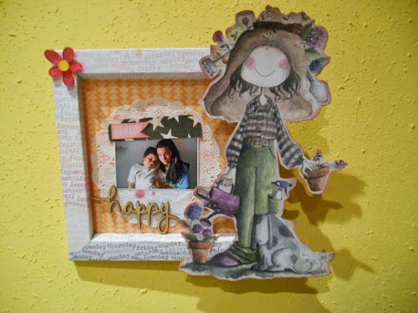 No me pude resistir y en Scrap plus Sitges compré unas hojas de Arte & Scrap, me encantan las ilustraciones, y he utlizado la de la nena jardinera, osease mi mami, le encantan las flores, si no tiene 300 macetas no tiene ninguna, para decorar el marco, es mi mami cuidando y regando a los pequeños capullitos (jejeje!!) para que crezcan sanas y rectos como un árbol.