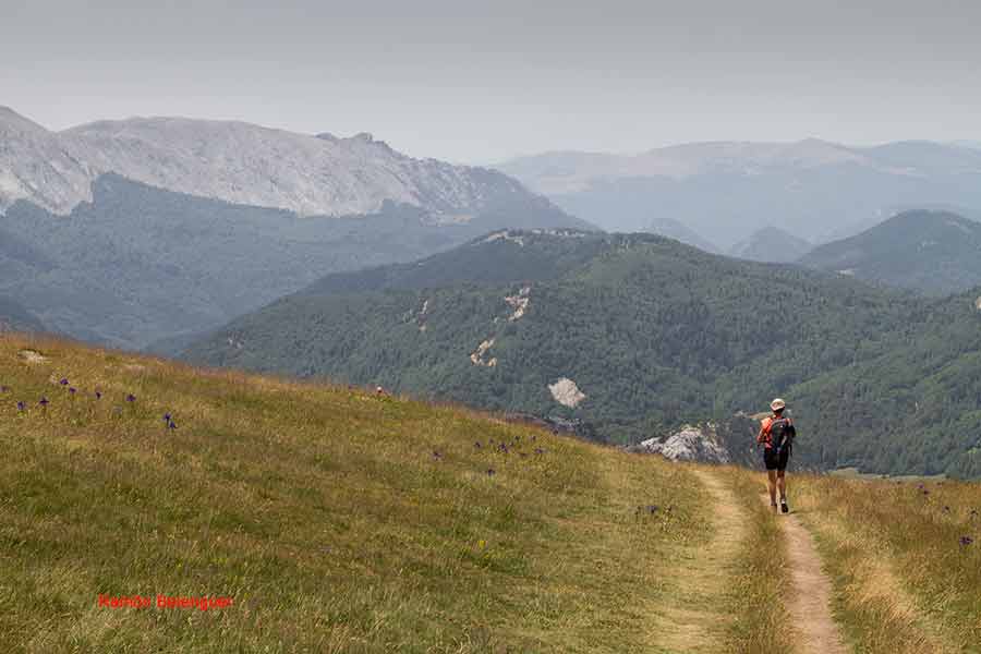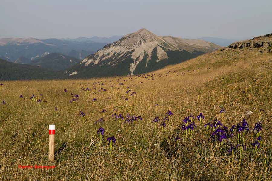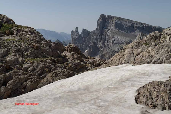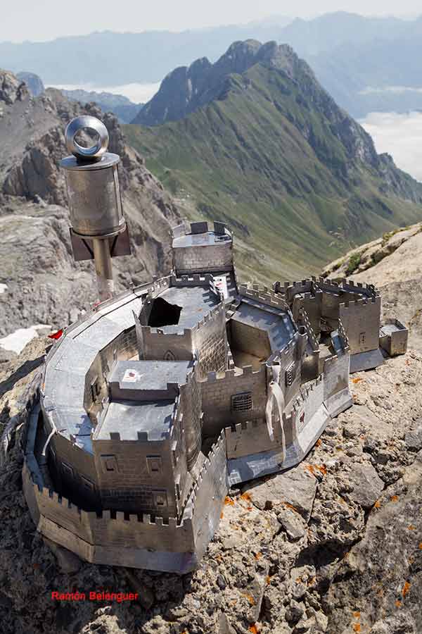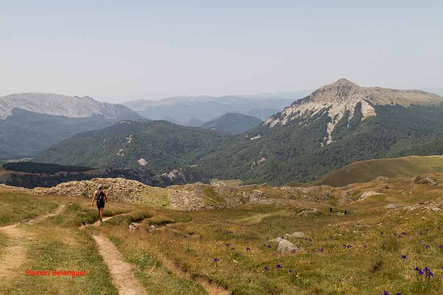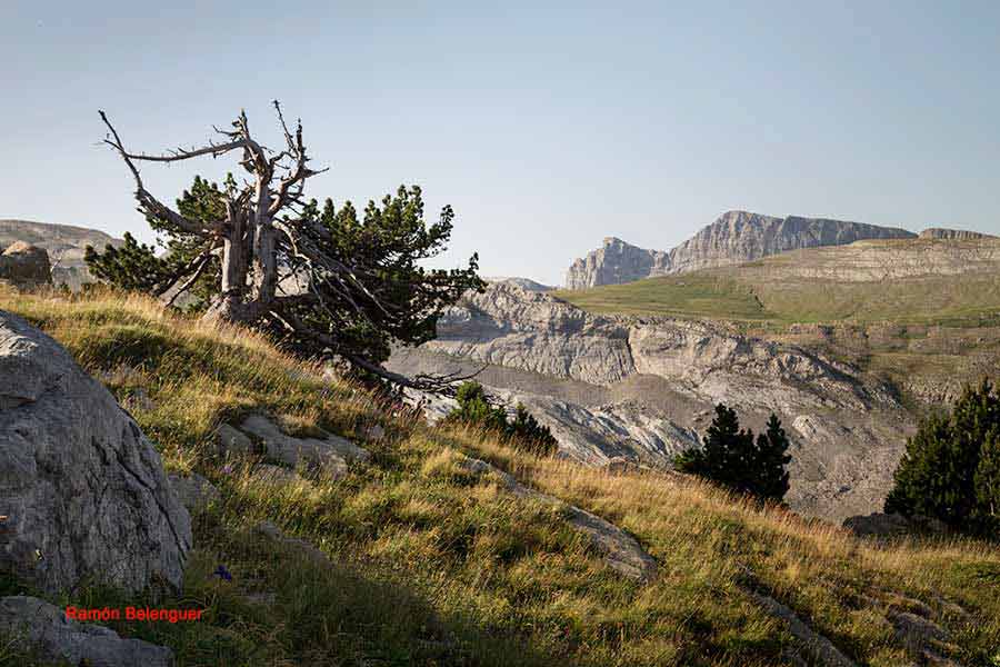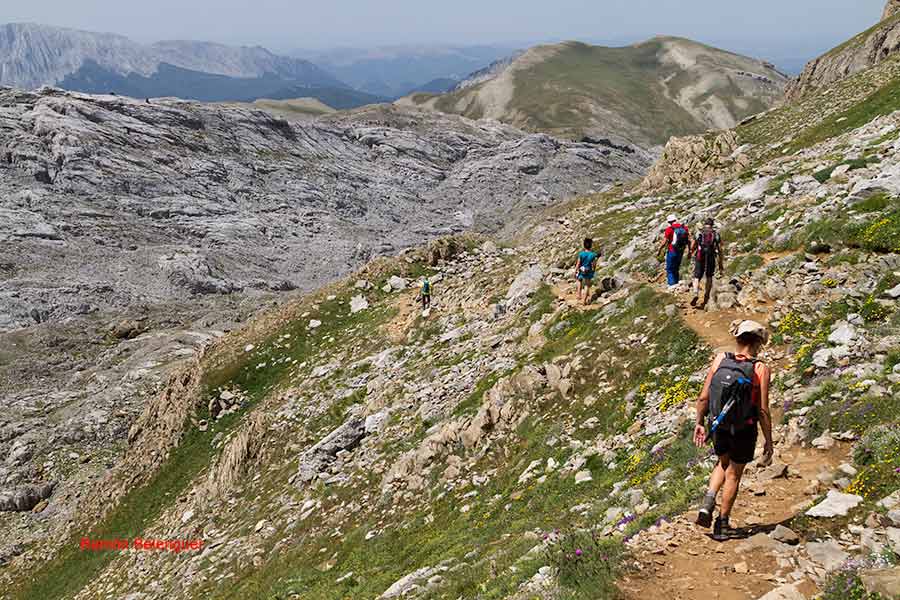 De ahí su denominación, ya que fue la confluencia de los antiguos reinos de Navarra, Aragón y el Vizcondado de Bearne (Francia). Según cuenta la leyenda, los reyes de estos tres estados medievales podrían citarse arriba en torno a una mesa de piedra -que es lo que parece esta montaña- y discutir sus asuntos cara a cara, sentados cada uno en su propio territorio. Aquí radica el interés de este monte, que aunque no tiene mojones clavados en tierra, resulta en sí mismo un enorme hito fronterizo de 2.442 metros. Las cimas del macizo de Larra, con el Anie, el Circo de Lescún, el Petreche,a (2371m)con sus agujas, el pirineo Navarro y, a lo lejos, el sector del Bisaurín (2.670 m) y del Midi d´Osssau (2.884 m).