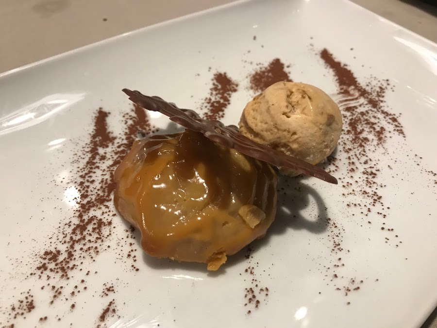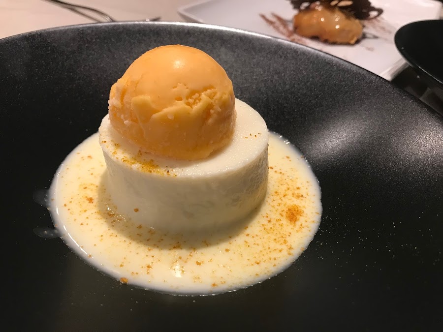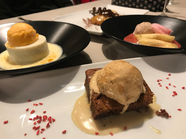 En cuanto a los postres, decidimos hacer lo mismo que al principio: compartirlos todos. De esta manera probamos el brownie de chocolate con sorbete de moka, el carpaccio de piña con algodón de azúcar y sorbete de frambuesa, la cuajada de leche de oveja con chocolate blanco y sorbete de mandarina y la tatín de pera con nata-nueces.