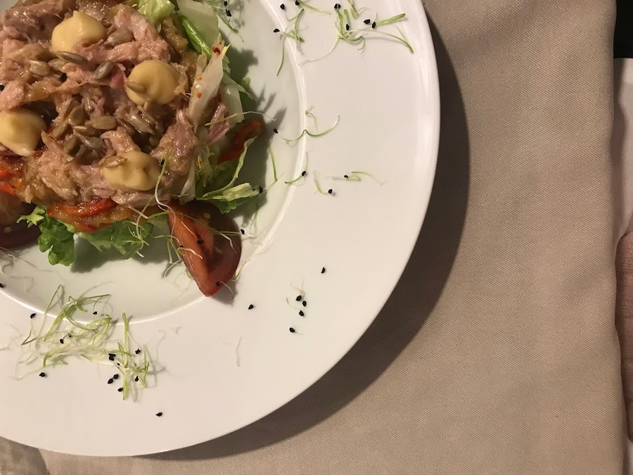 Ensalada de atún rojo en escabeche, manzana y escalivada