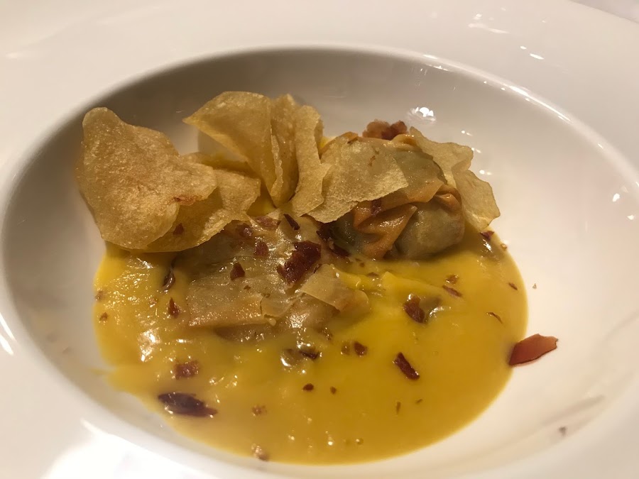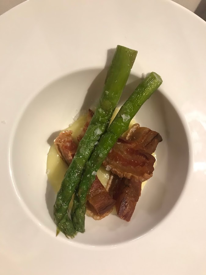 Para continuar, cada uno eligió un segundo plato. Yo me decanté por el torrezno, crema de patata al romero y trigueros. Poco después leí en uno de mis blogs preferidos, El Comidista, que el torrezno está de moda este año, ¡así que ya sabéis!