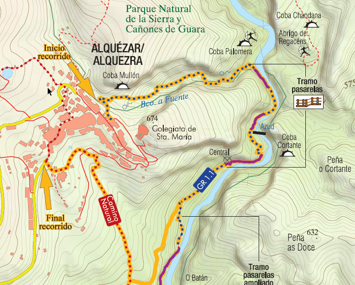 En el río Vero: la Cueva de Picamartillo, tramo por el rio hasta el Azud, la infraestructura de la antigua Central Hidroeléctrica: Azud, Canal, pasarelas y Central y las Pasarelas hasta el Mirador.