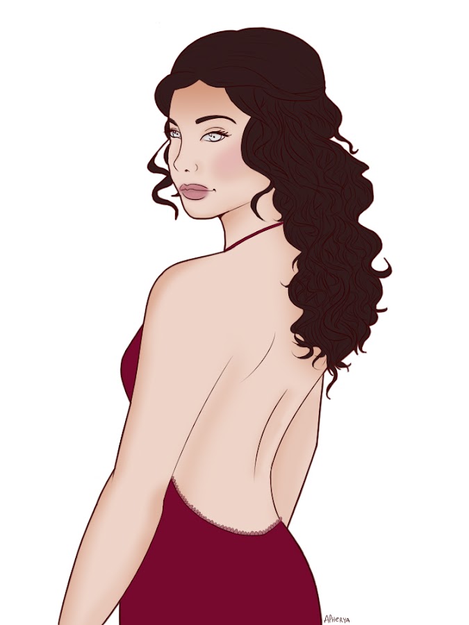 Para finalizar, cambié algunos tonos, pinté los ojos, añadí una textura gratuita en el vestido y le di algo más de vida al cabello, aclarando las puntas y oscureciendo la base.