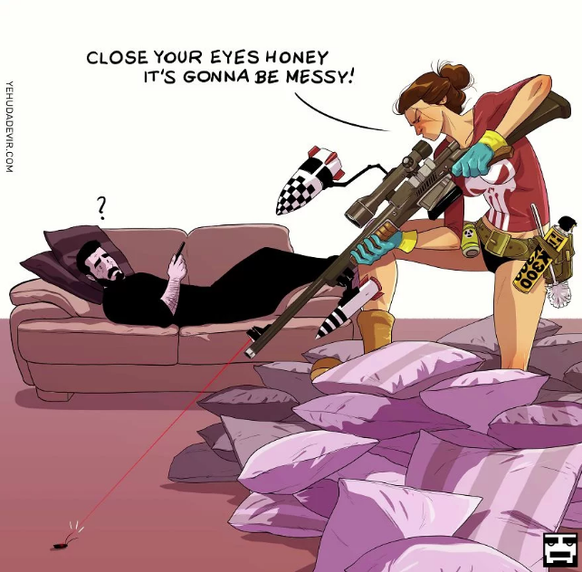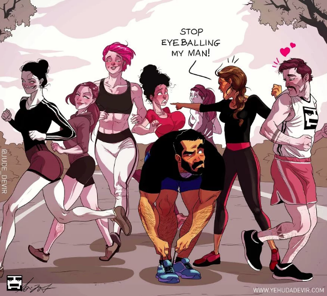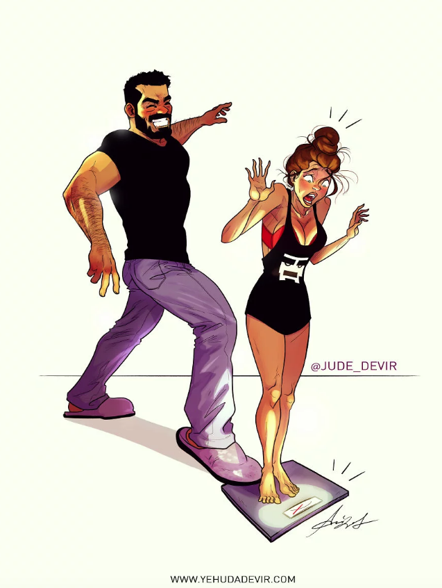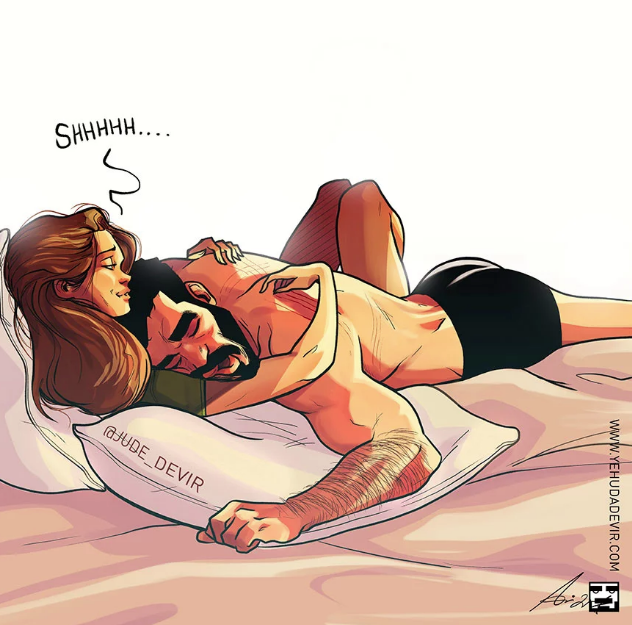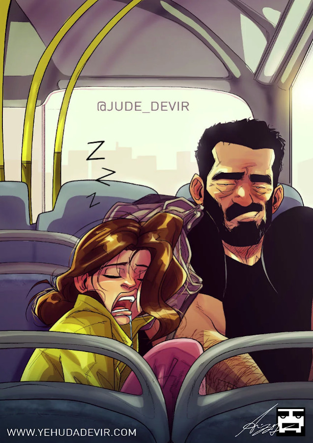 Aquí arriba podéis verle con su mujer Maya. Y de aquí en adelante podréis verle en la serie de viñetas que ha dibujado de situaciones cotidianas con su esposa. Un guiño amoroso a su mujer y que despierta la simpatía de cualquiera.