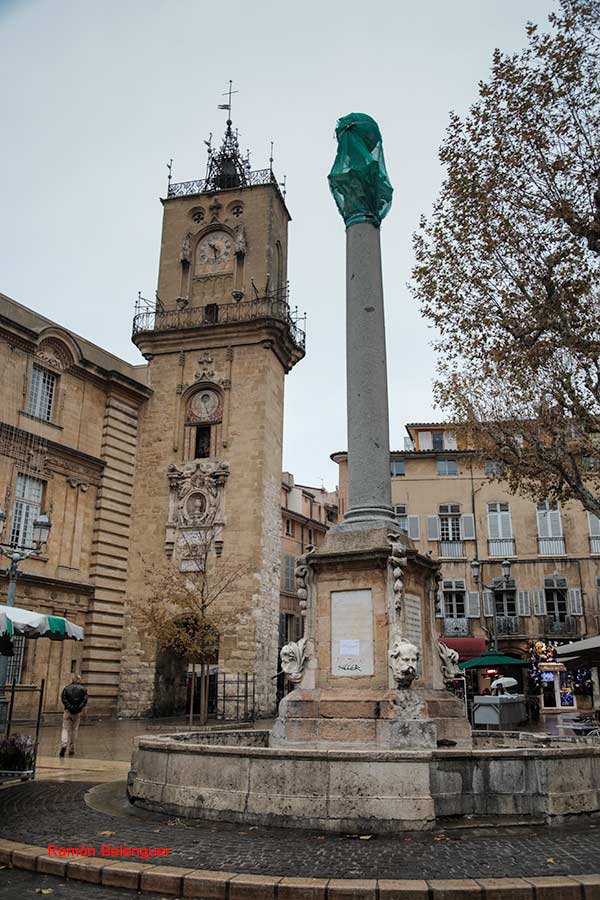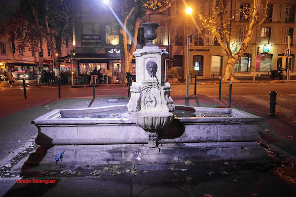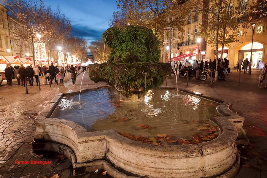 Aix es la ciudad de las fuentes. A partir de la segunda mitad del siglo XIX el agua fluye en abundancia por los estanques de las fuentes, gracias a los trabajos del canal de Verdon y a la presa Zola. En cualquiera de sus placitas, de los cruces de sus calles encontraremos una fuente. Antiguas, modernas, recién renovadas o a punto de desmoronarse. Grandes, pequeñas, impolutas o decoradas por el verdín, grandilocuentes, sencillas, simples, barrocas… fuentes, innumerables, llenando con el rumor del agua los vacios de la ciudad, transportándonos a otros tiempos, como en las novelas del aixois Zola.