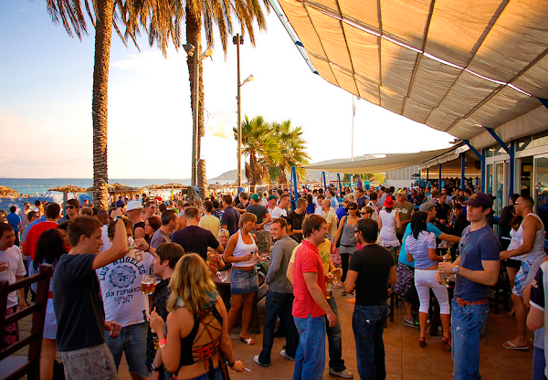 Y de la paz de unas calas a la marcha de otras: La playa d"en Bossa es uno de los lugares mas conocidos de la isla en cualquier aspecto. A pesar de que el viento sople con fuerza, el agua siempre está calmada. Pero esta playa incluso da nombre a un complejo turístico repleto de restaurantes, bares de copas y cualquier otros servicios. En ella se encuentran algunos clubs conocidos como el Bora Bora y en esta zona la playa nunca duerme. Sin embargo también hay zonas mas tranquilas y familiares. (Ibiza) Foto de Chris Walker