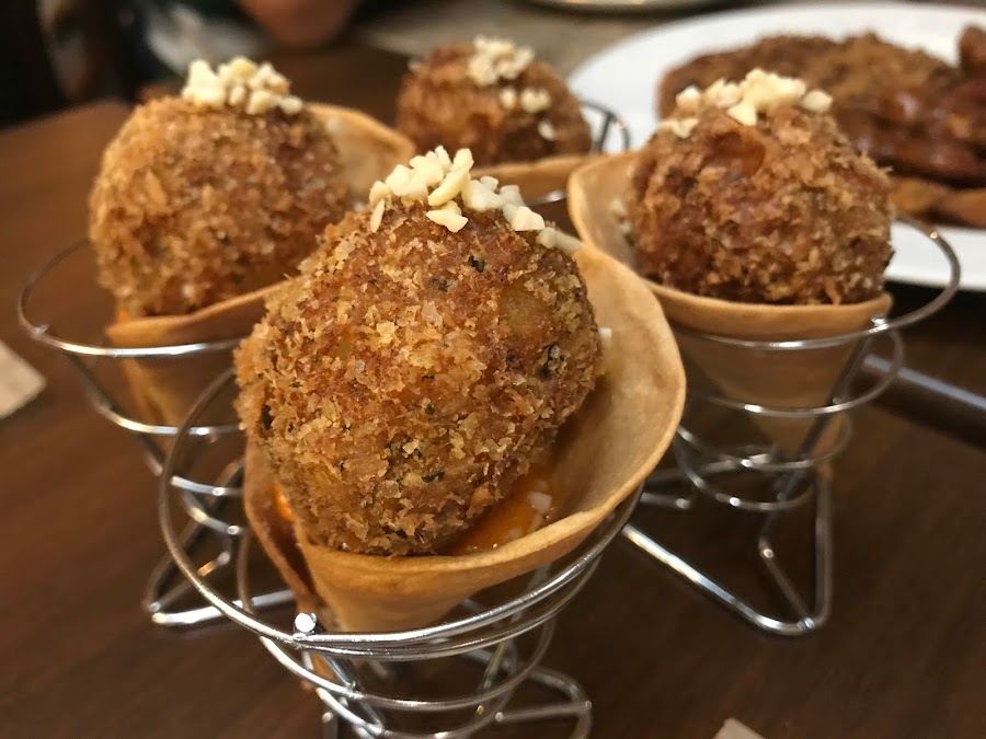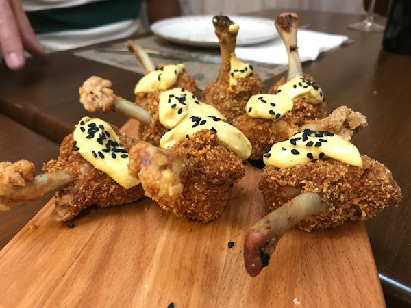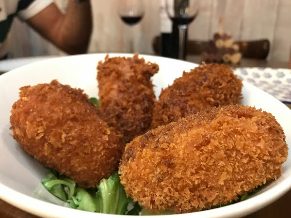 Probablemente es el pulpo más tierno que he probado en mi vida...se notaba que estaba (bien) confitado, y la mezcla con hummus y la salsa oriental que lo acompañaba daban el toque perfecto. Seguimos con los croquetones de jamón y pollo. Aquí sí que fuimos a lo más tradicional, y es que mi chico es un fan acérrimo de las croquetas, así que es complicado comer con él en la misma mesa sin que pida un plato. Como el resto de comensales tampoco es que le hiciéramos ascos a nada (todo lo contrario)...¡pues pa dentro las croquetas! Muy muy buenas, por cierto.