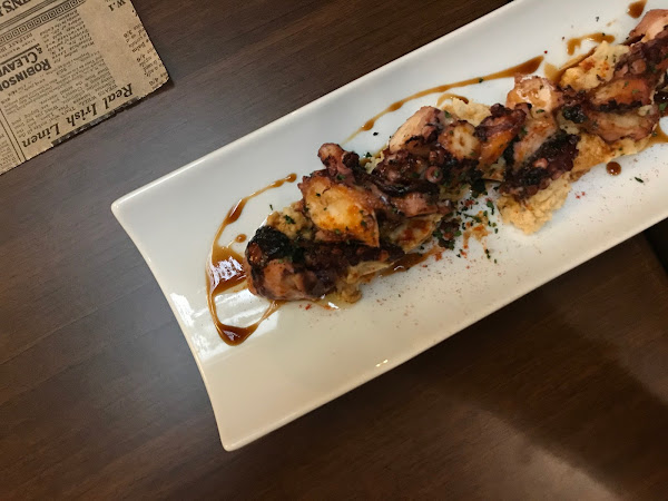 La carta de Le Bistrot es muy original. Tiene platos que no puedes encontrar en cualquier sitio, mezclas inimaginables, fusión de ingredientes tradicionales con orientales, en definitiva: es diferente. Nosotros comenzamos pidiendo un pulpo confitado con hummus: