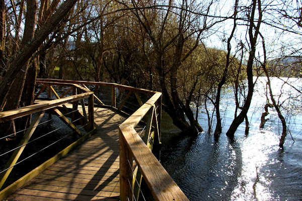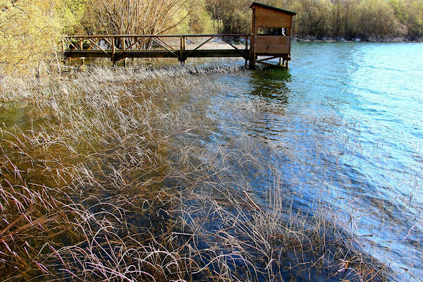 Una pasarela de madera perfectamente mimetizada con el entorno nos lleva a una caseta de observación desde la que es posible contemplar con discreción las evoluciones de las aves acuáticas que utilizan la zona, sobre todo las anátidas y somormujos