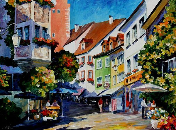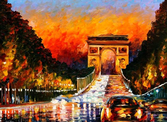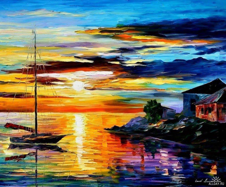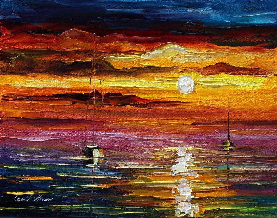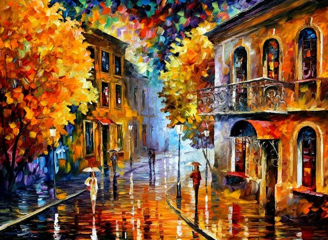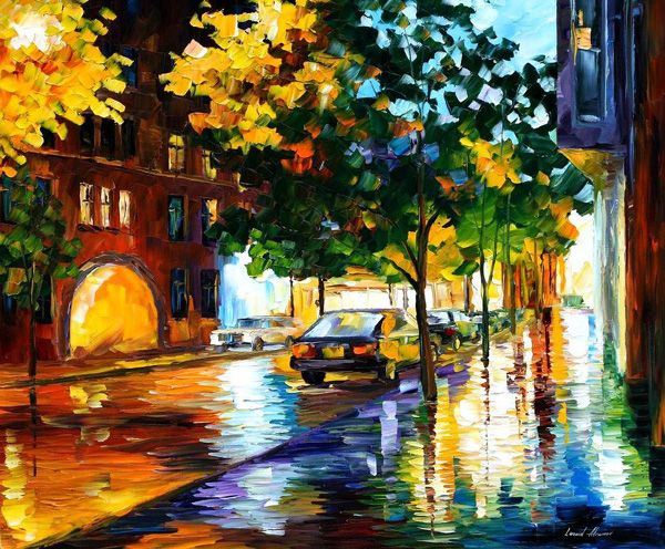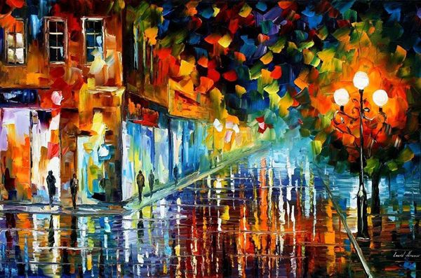 Las piezas gráficas de Afremov, en cuanto a su colorido, son muy variadas. El artista presenta en sus diferentes obras los diversos contrastes del color. Otro elemento destacable de la obra de Afremov es la presencia de texturas y ambientes cromáticos. La particular técnica de la pintura sin pincel, mediante el uso directo de la espátula, otorga al cuadro un relieve interesante, que además sugiere la presencia de diversas capas de colores debajo de los tonos presentes en la superficie. Los colores en las obras de Afremov nunca se presentan como planos, sino que son el resultado de múltiples mezclas ópticas que se logran mediante la interacción del color aplicado en capas de pigmento.