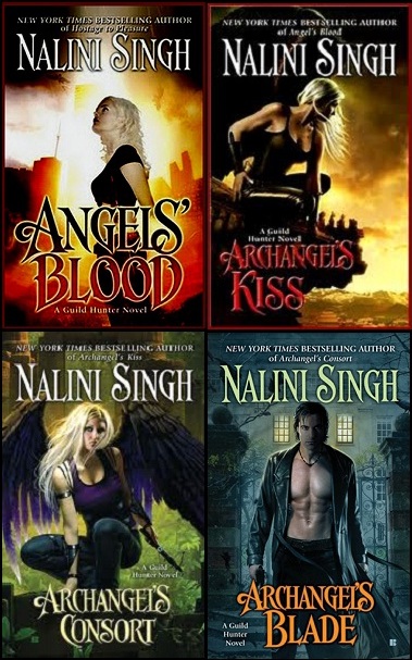Una saga para mayores de 18 años que me gusta mucho. Se desarrolla en un mundo donde es liderado por arcángeles y ángeles, estos vuelan por las ciudades y poseen oficinas en lo más alto de los edificios, los vampiros son de cierta forma los asistentes de los ángeles quienes deben estar bajo su servicio por una cantidad de años luego de ser convertidos. Cuando los mismos desobedecen órdenes o tratan de escaparse de sus amos entra en acción el Gremio de cazadores quienes son los encargados de dar caza a estos vampiros rebeldes. Elena Deveraux una mortal y nuestra protagonista, es una de las mejores cazadoras del gremio con un talento innato por el cual ha sido expulsada de su seno familiar. Gracias a este talento es contratada por el poderoso Arcángel Rafael para la difícil misión de rastrear a un ángel rebelde. Durante toda la búsqueda y trama del libro se crea una carga de atracción entre los protagonista que llega a significar la muerte de alguno de los dos.