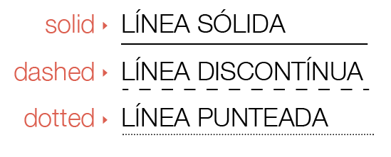 También podemos cambiar el estilo de la línea que enmarca o subraya nuestro título, podemos dejarla normal (solid), podemos hacerla discontinua (dashed) o de puntitos (dotted). Para ello tenemos que cambiar la palabra solid de nuestro código por cualquiera de las otras dos: dashed (si la queremos discontinua) o dotted (si la queremos punteada)