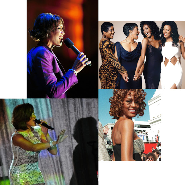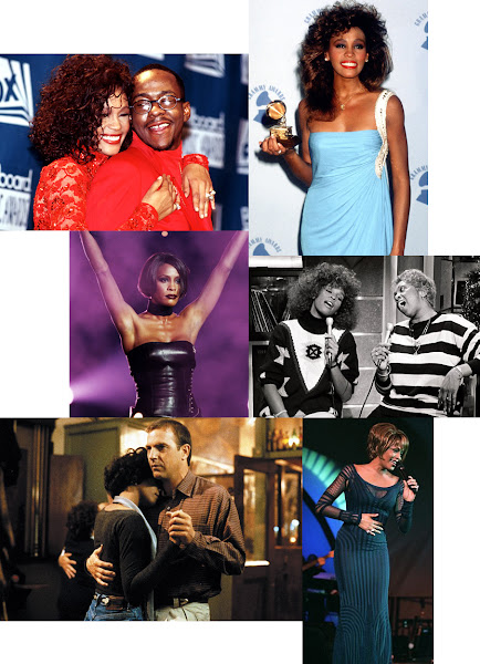 De izqu. a derech.: Whitney y Bobby Brown en los Billboard de 1994. Con su primer Grammy en 1986. Actuando en los Brit Awards de 1999. Cantando junto a su madre Cissy Houston. Escena de la popular película El Guardaspaldas y Whitney actuando en 1997.