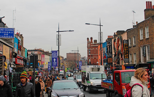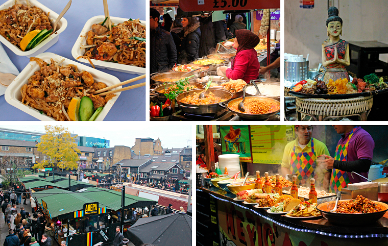 Avanzamos en dirección a los puestos de street-food como si fuésemos siguiendo el olor a comida. Yo ya conocía Camden de mi otra visita, pero esta vez fue como re-descubrir la zona de restauración. Me era inevitable pensar en Mario y la de cosas ricas de cualquier parte del mundo que se estaba perdiendo y es que la zona de comida es quizás lo que más llamó mi atención. Un gran mercado con pequeños puestecillos de comida de cualquier parte: Venezuela, Italia, Vietnam, Tailandia, Colombia, Hungría, Méjico, Turquía, Marruecos, China... además vas observando los puestos para escoger dónde comer y con suerte te van ofreciendo para que puedas ir degustando y así sea más fácil elegir. El lado negativo (no iba a ser todo tan bonito, y además es Londres!) es que no por comer en la calle sale barato. Desde luego más barato que un restaurante sí que lo es... pero un simple plato de comida (sin bebida) puede costar 8 - 9 y reza para encontrar un sitio donde poder apoyar el plato y comer tranquilo (ya sea sentad@ o de pie). Recuerda buscar primero un sitio donde sentarte, que alguien lo guarde y otra persona que vaya a hacer cola y comprar la comida. Solo así podrías "asegurarte" de comer sentado.