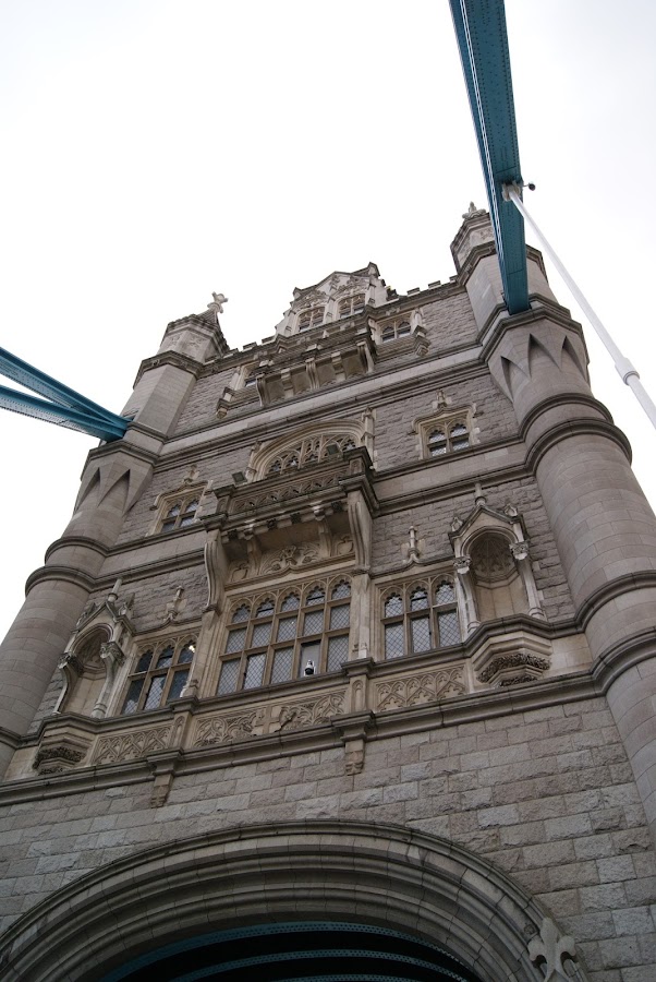 Cuando nos situamos justo debajo, nos llama la atención la pasarela que va de una a otra torre cuyo suelo es de cristal y eso hace que tomemos un ascensor o subamos los 300 peldaños, para ver la perspectiva desde arriba. Este camino aéreo, que en su momento estuvo abierto, está bien guarnecido por los lados, para evitar la moda que hubo de venir a suicidarse al Puente de la Torre y para formar parte de la exposición que acoge el edificio sobre los más famosos puentes del mundo.