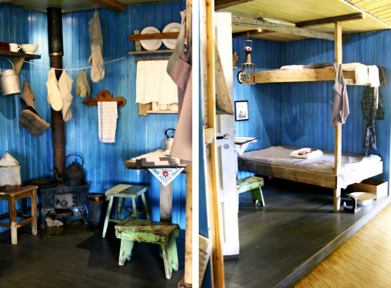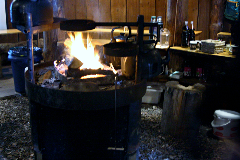 madera, con el fuego encendido, las cafeteras y unos gofres noruegos con