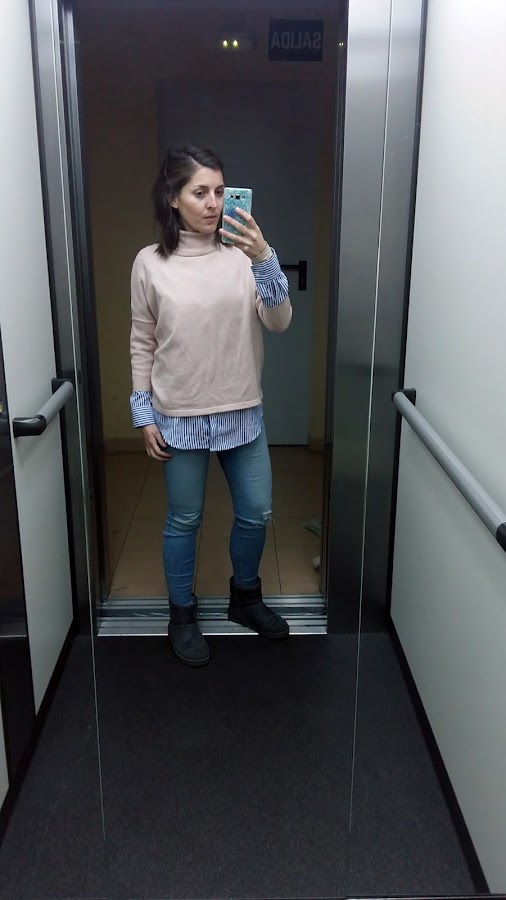 Este fue el mismo día pero para cenar. Dejé la camisa y lo combiné con el jersey de Shana. Me gusta mucho como queda y al llevar varias capas iba bastante calentita.